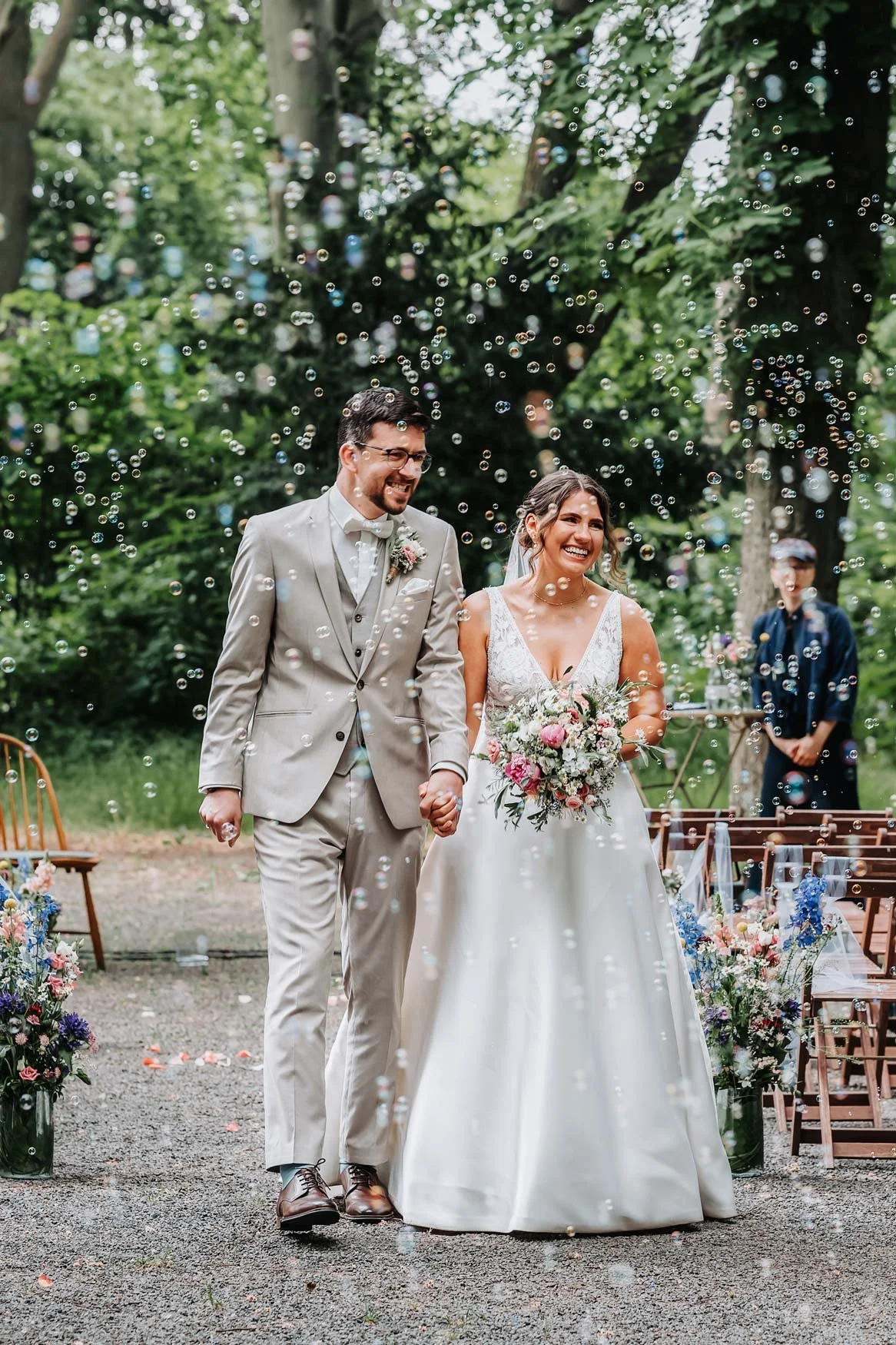„Schon vor dem ersten Treffen war Max einfach unglaublich sympathisch – aufmerksam, gut vorbereitet und mit einem feinen Gespür dafür, was wir uns gewünscht haben. Am Tag der Trauung war Max von Anfang an mit ganzem Herzen dabei – präsent, organisiert und voller Energie. Selbst die Fotomuffel hat er zum Lächeln gebracht und die ganze Gruppe mit viel Ruhe und Humor geleitet. Die fertigen Fotos haben uns sprachlos gemacht – besonders die Aufnahmen während der Trauung und beim Sektempfang. Es war, als wären wir nochmal mittendrin. Max hat einfach ein Auge für die besonderen Momente.“